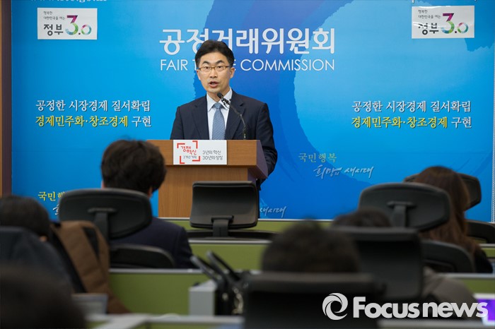 (세종=포커스뉴스) 정창욱 공정거래위원회 서비스업감시과장이 13일 오전 세종시 공정위 브리핑룸에서 총수 친족회사 밀어준 현대그룹에 대해 총수일가 사익편취 및 부당지원 행위로 시정명령과 과징금 12억 8500만원을 부과했다고 밝히고 있다.