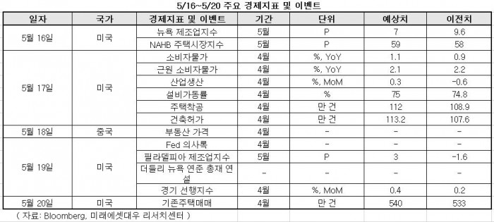 이번주 주목할 이벤트와 경제지표는 △중국 4월 부동산 가격 발표 △미국 4월 연방공개시장위원회(FOMC) 의사록 발표 등이 있다.