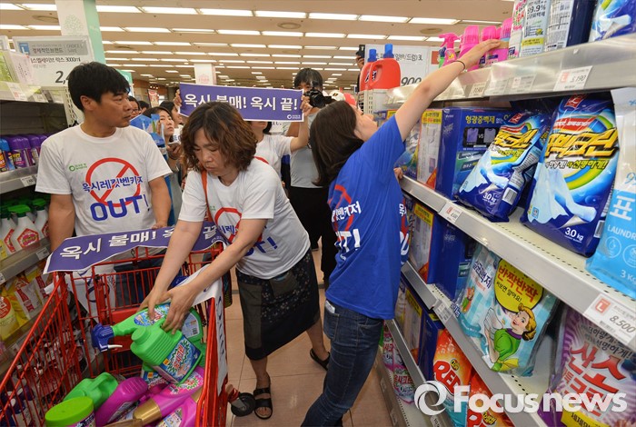 (서울=포커스뉴스) 15일 오전 서울 용산구의 한 대형마트에서 환경운동연합 회원들이 옥시제품 판매 즉각 철수를 촉구하며 불매운동 퍼포먼스를 하고 있다.