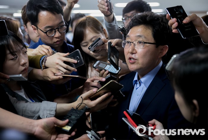 (서울=포커스뉴스) 새누리당 혁신위원장으로 임명된 김용태 의원이 15일 오후 서울 여의도 당사에서 기자회견을 마친 뒤 취재진 질문에 답하고 있다.