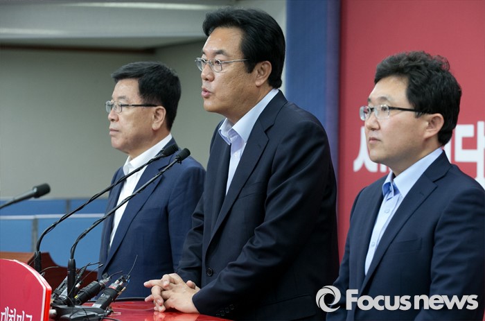 (서울=포커스뉴스) 정진석(가운데) 새누리당 원내대표와 김광림(왼쪽) 정책위의장이 15일 오후 서울 여의도 당사에서 혁신위원장으로 임명된 김용태 의원과 함께 기자회견을 하고 있다.