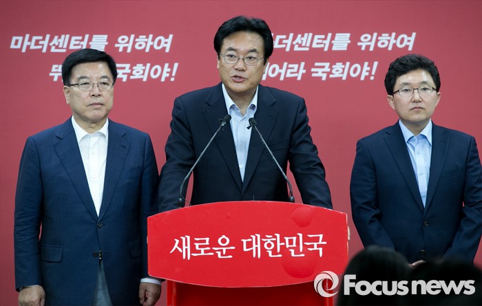 (서울=포커스뉴스) 정진석(가운데) 새누리당 원내대표와 김광림(왼쪽) 정책위의장이 15일 오후 서울 여의도 당사에서 혁신위원장으로 임명된 김용태 의원과 함께 기자회견을 하고 있다.