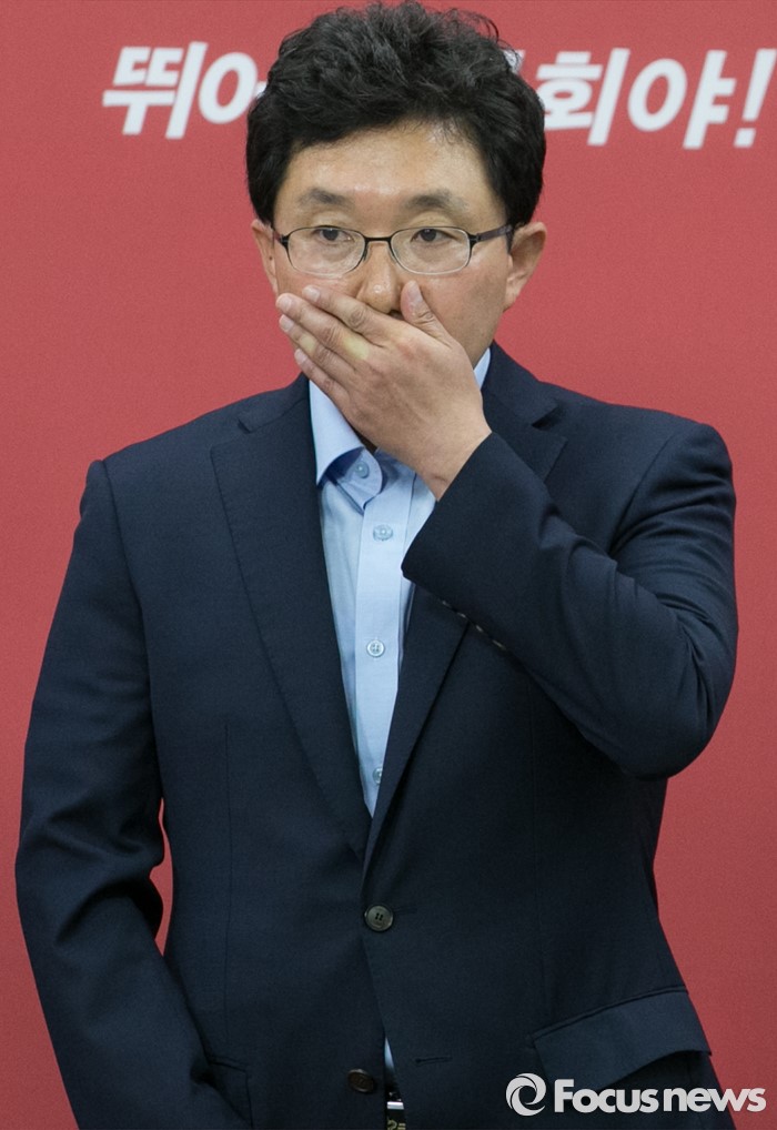(서울=포커스뉴스) 새누리당 혁신위원장으로 임명된 김용태 의원이 15일 오후 서울 여의도 당사에서 정진석 원내대표와 함께 기자회견을 하던 중 얼굴을 만지고 있다.