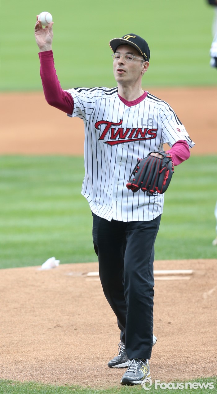 (서울=포커스뉴스) 8일 서울 잠실구장에서 열린 2016 프로야구 SK-LG 경기에 앞서 프랑스 소설가 베르나르 베르베르가 시구하고 있다.