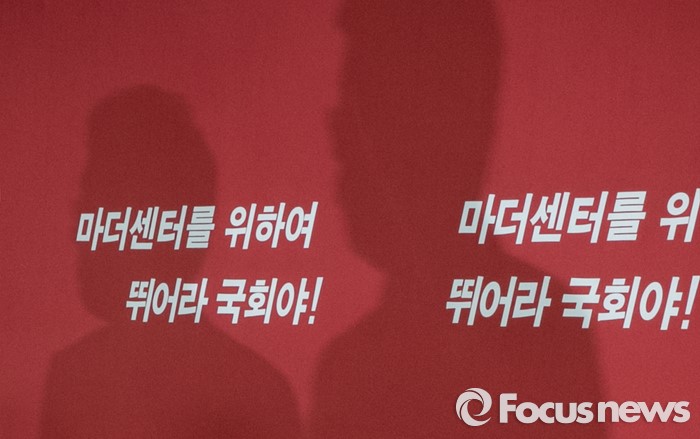 (서울=포커스뉴스) 새누리당 혁신위원장으로 임명된 김용태(왼쪽) 의원과 김광림 정책위의장의 그림자가 15일 오후 서울 여의도 당사에서 기자회견장에 보이고 있다.