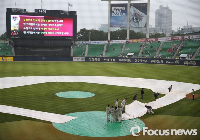 (서울=포커스뉴스) 15일 서울 잠실구장에서 열린 2016 프로야구 SK-LG 경기가 2회말을 마치고 우천으로 경기가 중단되자 구장 관리직원들이 비가림막을 설치하고 있다.