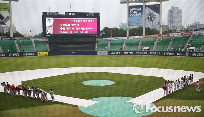 (서울=포커스뉴스) 15일 서울 잠실구장에서 열린 2016 프로야구 SK-LG 경기가 2회말을 마치고 우천으로 경기가 취소되자 양팀 선수들이 그라운드에 나와 팬에게 인사하고 있다.