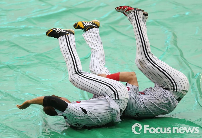 (서울=포커스뉴스) 15일 서울 잠실구장에서 열린 2016 프로야구 SK-LG 경기가 2회말을 마치고 우천으로 경기가 취소되자 LG 채은성(왼쪽)과 오지환이 팬 서비스로 비가 괴인 비가림막 위에서 슬라이딩을 하고 있다.