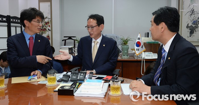 (서울=포커스뉴스) 김도읍(가운데) 새누리당 원내수석부대표, 박완주(왼쪽) 더불어민주당 원내수석부대표, 김관영 국민의당 원내수석부대표가 15일 오후 서울 여의도 국회 의원회관에서 19대 국회 마지막 본회의 안건 및 20대 국회 원구성 협상 등을 논의하고 있다.