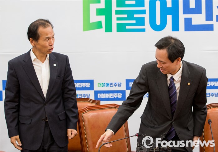 (서울=포커스뉴스) 16일 오전 서울 여의도 국회 더불어민주당 원내대표회의실을 방문한 최문순 강원도지사가 우상호 원내대표와 함께 착석하고 있다.
