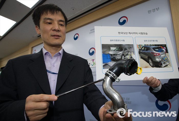 (세종=포커스뉴스) 홍동곤 환경부 교통환경과장이 16일 오전 세종시 정부세종청사 환경부 기자실에서 브리핑을 열고 지난해 12월부터 지난 4월까지 150일 동안 국내에서 판매된 경유자동차 20종을 조사한 결과 한국닛산 캐시카이 차량의 배기가스를 불법 조작하는 임의설정 한 것으로 판단된다고 밝히고 있다. 환경부는 한국닛산에 3억3000만원의 과징금 부과와 함께 판매정지 및 리콜(814대) 명령을 내릴 계획이다.
