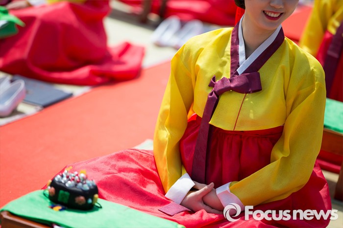 (서울=포커스뉴스) 16일 오전 서울 중구 남산골 한옥마을 천우각 광장에서 열린 제44회 성년의 날 행사에 참석한 학생들이 전통 성년례를 올리고 있다.