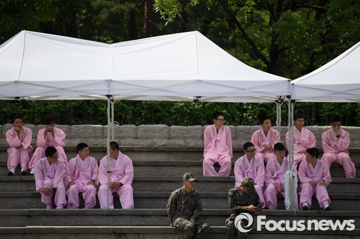 (서울=포커스뉴스) 16일 오전 서울 중구 남산골 한옥마을 천우각 광장에서 열린 제44회 성년의 날 행사에 참석한 학생들이 행사 시작을 기다리고 있다.