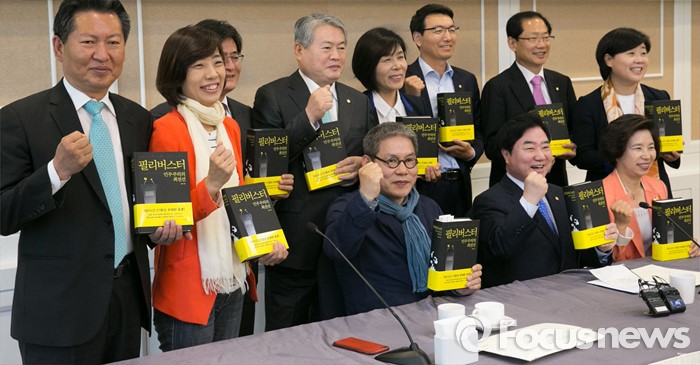 (서울=포커스뉴스) 이석현 국회 부의장과 필리버스터 발언 의원들이 16일 오후 서울 여의도 국회 귀빈식당에서 열린 오찬 간담회에 참석해 의원들의 발언을 책으로 엮은 '필리버스터 : 민주주의 최전선' 도서를 들고 취재진을 향해 포즈를 취하고 있다.
