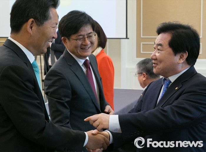 (서울=포커스뉴스) 이석현(오른쪽) 국회 부의장이 16일 오후 서울 여의도 국회 귀빈식당에서 열린 필리버스터 발언 의원 초청 오찬 간담회에 참석해 정청래(왼쪽) 더불어민주당 의원과 인사하고 있다. 가운데는 박원석 정의당 의원.