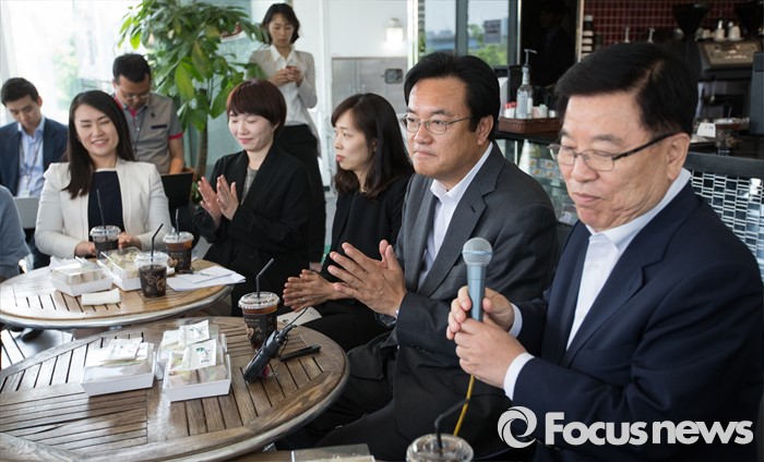 (서울=포커스뉴스) 정진석(오른쪽 두번째) 새누리당 원내대표와 김광림(오른쪽) 정책위의장이 16일 오후 서울 여의도 한강공원의 한 카페에서 '3040여성당직자 브라운백 미팅'을 갖고 있다.