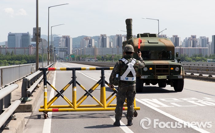 (서울=포커스뉴스) 제401차 민방위의 날인 16일 오후 서울 용산구 반포대교에서 군·경 관계자들이 합동 전시 교통통제소 설치 민방공대피훈련을 하고 있다.