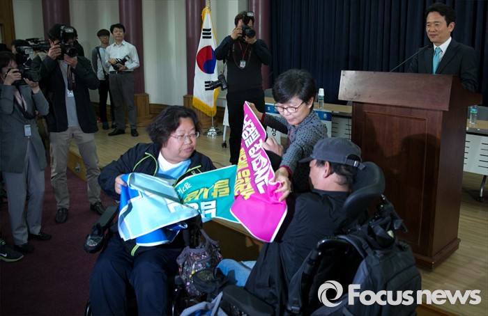 (서울=포커스뉴스) 16일 오후 서울 여의도 국회 의원회관에서 열린 '20대 국회, 협치 가능한가' 토론회에 참석한 남경필 경기도지사의 인사말 도중 장애인 이동권 보장을 요구하는 경기420장애인차별철폐공동투쟁단 등이 남 지사와 면담을 요구하며 손피켓을 들고 있다.