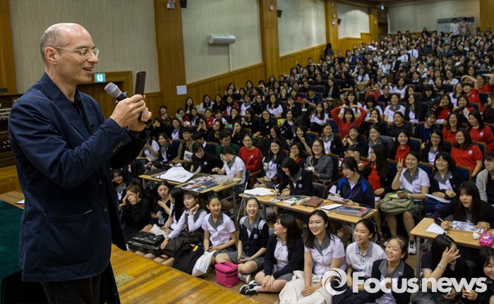 (서울=포커스뉴스) 16일 오후 서울 종로구 서울예술고등학교를 찾은 프랑스 작가 베르나르 베르베르가 '오늘날의 예술적 지능'이란 주제로 강연 도중 학생들을 촬영하고 있다.