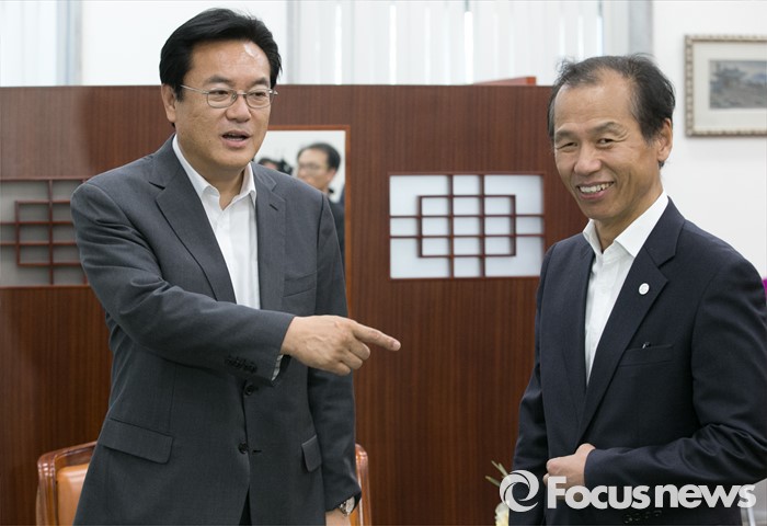 (서울=포커스뉴스) 정진석(왼쪽) 새누리당 원내대표가 16일 오후 서울 여의도 국회를 방문한 최문순 강원도지사와 만나 대화하고 있다.