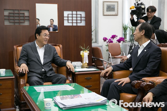 (서울=포커스뉴스) 정진석(왼쪽) 새누리당 원내대표가 16일 오후 서울 여의도 국회를 방문한 최문순 강원도지사와 만나 면담을 하고 있다.
