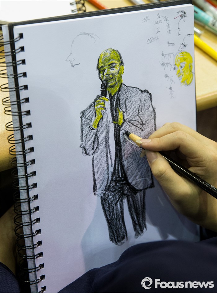 (서울=포커스뉴스) 16일 오후 서울 종로구 서울예술고등학교에서 열린 프랑스 작가 베르나르 베르베르 강연회에 참석한 학생이 강연자를 그리고 있다.