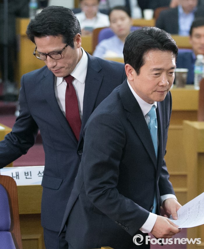 (서울=포커스뉴스) 16일 오후 서울 여의도 국회 의원회관에서 열린 '20대 국회, 협치 가능한가' 토론회에 참석한 남경필(오른쪽) 경기도지사, 정병국 새누리당 의원이 각각 인사말을 위해 자리로 향하고 있다.