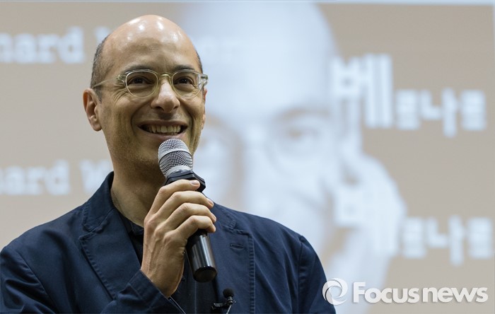 (서울=포커스뉴스) 16일 오후 서울 종로구 서울예술고등학교를 찾은 프랑스 작가 베르나르 베르베르가 '오늘날의 예술적 지능'이란 주제로 학생들에게 강연하고 있다.
