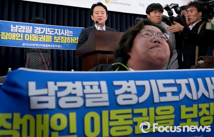 (서울=포커스뉴스) 16일 오후 서울 여의도 국회 의원회관에서 열린 '20대 국회, 협치 가능한가' 토론회에 참석한 남경필 경기도지사의 인사말 도중 장애인 이동권 보장을 요구하는 경기420장애인차별철폐공동투쟁단 등이 남 지사와 면담을 요구하며 손피켓을 들고 있다.