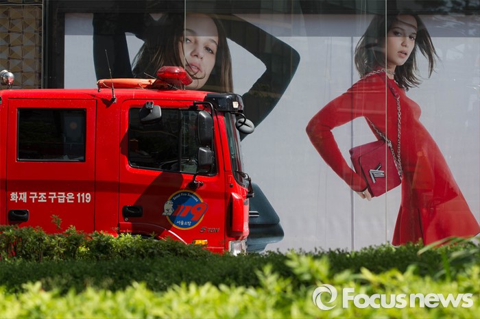 (서울=포커스뉴스) 16일 오후 서울 송파구 제2롯데월드몰에서 '재난대응 안전한국훈련'이 열렸다. 제2롯데월드몰 인근에 소방차가 주차되어 있다.