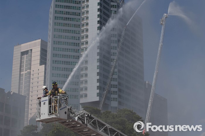 (서울=포커스뉴스) 16일 오후 서울 송파구 제2롯데월드몰에서 소방관들이 '재난대응 안전한국훈련'에 참가해 화재진압 훈련을 하고 있다.