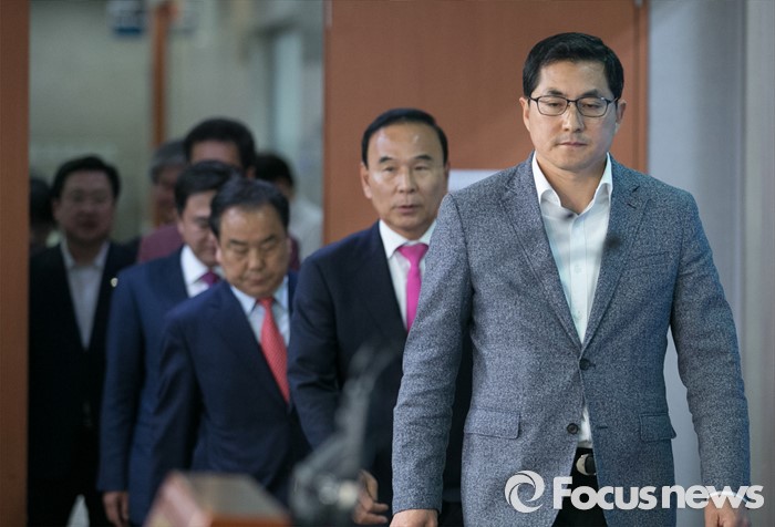 (서울=포커스뉴스) 16일 오후 서울 여의도 국회 정론관에서 새누리당 초·재선 의원 및 당선인들이 당 혁신위와 비대위원 재검토를 요구하는 성명서 발표 기자회견을 위해 입장하고 있다. 오른쪽부터 박대출, 박덕흠, 이우현, 김태흠 의원.