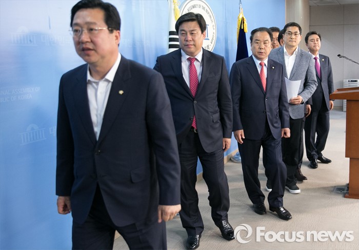 (서울=포커스뉴스) 16일 오후 서울 여의도 국회 정론관에서 새누리당 초·재선 의원 및 당선인들이 당 혁신위와 비대위원 재검토를 요구하는 성명서 발표 기자회견을 마친 뒤 퇴장하고 있다. 왼쪽부터 이장우 의원, 김선동 당선인, 이우현, 함진규, 박대출, 김태흠 의원.
