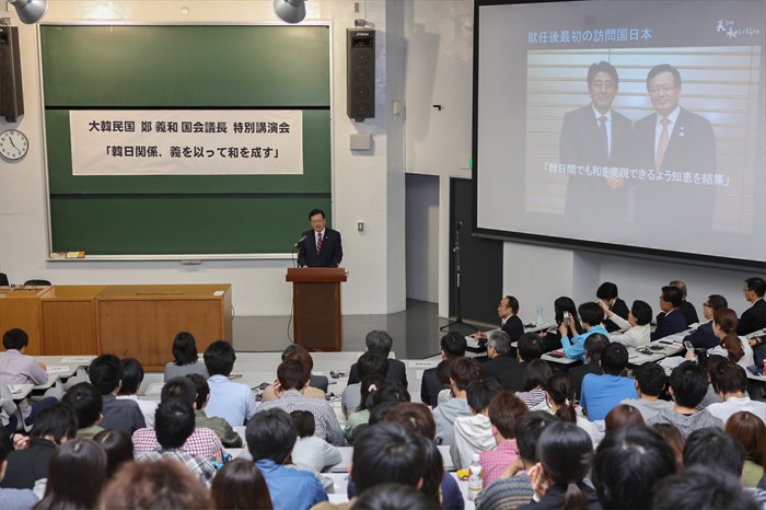 (서울=포커스뉴스) 일본을 공식 방문중인 정의화 국회의장이 16일 오전 일본 중앙대에서 '한일관계, 의(義)로써 화(和)를 이루자'란 주제로 강연을 하고 있다. <사진제공=국회>