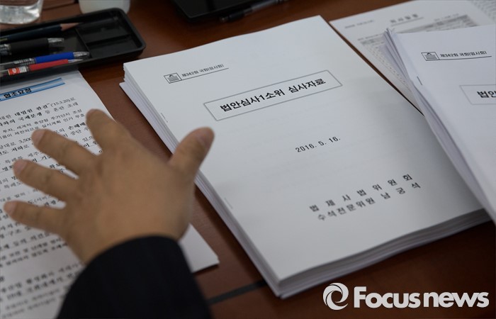 (서울=포커스뉴스) 16일 오후 서울 여의도 국회에서 열린 법제사법위원회 법안심사1소위에 법안 심사자료가 놓여져 있다. 이날 소위에서는 사시존치 관련 법안 등을 논의할 예정이다.