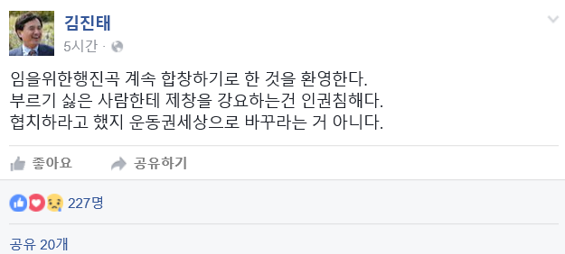 김 의원은 이날 오후 자신의 페이스북에 이같이 밝히며 "부르기 싫은 사람한테 제창을 강요하는 건 인권침해"라고 주장했다.