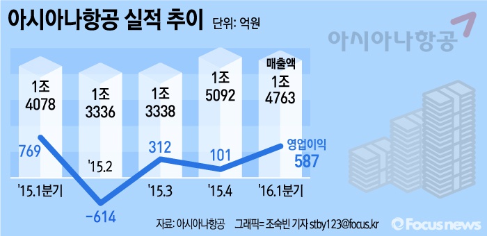 (서울=포커스뉴스) 아시아나항공은 올해 1분기 영업이익을 587억원으로 지난해 같은 기간보다 587억원 감소했다고 16일 발표했다.
