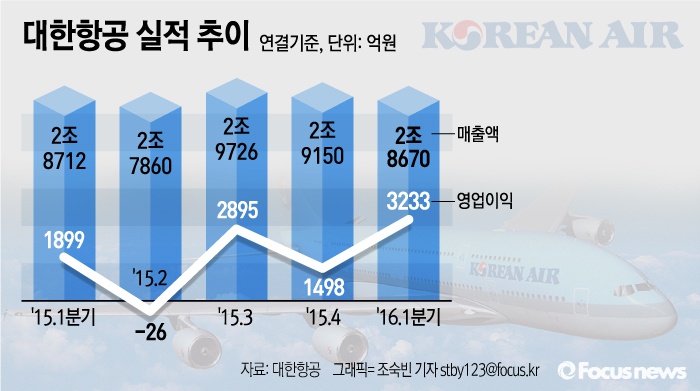 (서울=포커스뉴스) 대한항공은 올해 1분기 연결기준 영업이익이 3233억원을 나타냈다고 16일 발표했다. 이는 전년 동기대비 70.2% 증가한 수치다.