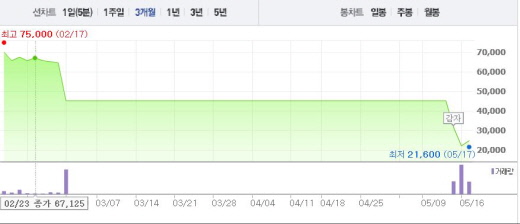 삼부토건은 지난 2월26일 보통주 880만여주를 148만여주로 줄이는 1차 감자를 단행했고, 이후 유상증자를 통해 6078만여주 신주를 발행했다. 이를 다시 623만주로 줄이는 2차 감자를 실시하면서 거래가 2달 이상 중단됐다.주가흐름<사진출처=네이버 캡쳐>