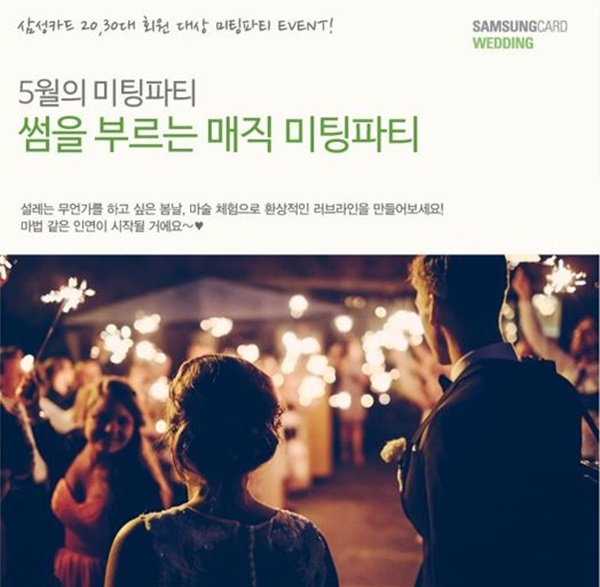이번 미팅파티는 삼성카드 20~30대 미혼남녀 각 8명(총16)을 대상으로 진행되며, 참가비는 전액 무료다.