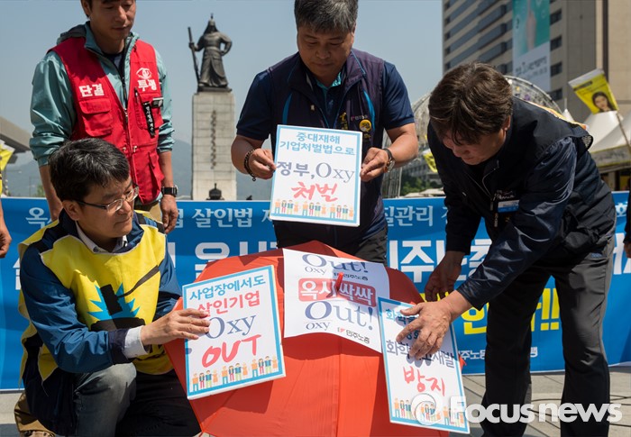 (서울=포커스뉴스) 17일 오전 서울 광화문광장에서 열린 '옥시 불매, 사업장 옥시 OUT' 선언 기자회견에 참석한 민주노총 조합원 및 가습기 살균제 피해자 가족들이 옥시를 규탄하는 퍼포먼스를 하고 있다.