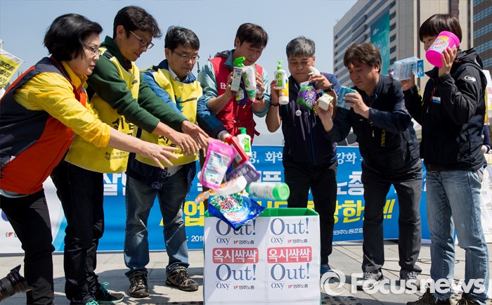 (서울=포커스뉴스) 17일 오전 서울 광화문광장에서 열린 '옥시 불매, 사업장 옥시 OUT' 선언 기자회견에 참석한 민주노총 조합원 및 가습기 살균제 피해자 가족들이 옥시를 규탄하는 퍼포먼스를 하고 있다.