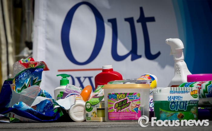 (서울=포커스뉴스) 17일 오전 서울 광화문광장에서 열린 '옥시 불매, 사업장 옥시 OUT' 선언 기자회견장에 옥시 제품들이 내팽개쳐저 있다.
