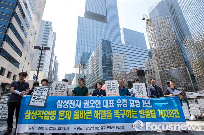 (서울=포커스뉴스) 17일 오전 서울 서초구 서초동 삼성전자 서초사옥 앞 반올림 농성장에서 반올림 관계자들이 삼성직업병 문제 올바른 해결을 촉구하는 반올림 기자회견을 하고 있다.