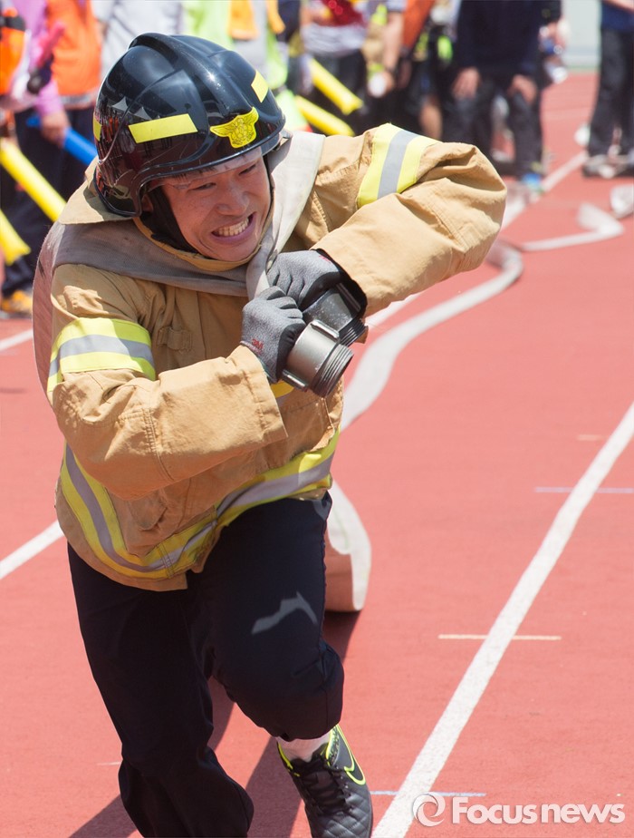 (서울=포커스뉴스) 17일 오전 서울 양천구 목동운동장에서 열린 2016 의용소방대 종합소방기술경연대회에서 참가자들이 소방호스 끌기 경기를 하고 있다.
