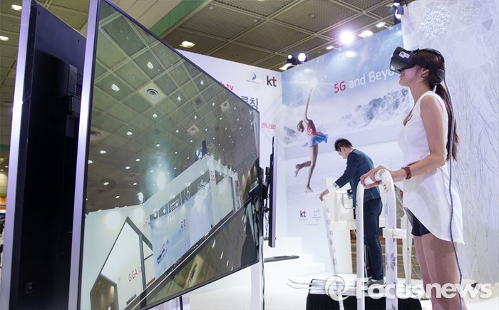 (서울=포커스뉴스) 17일 오전 서울 강남구 코엑스에서 열린 '월드 IT쇼 2016' 의 KT부스의 한 도우미가 가상현실 시스템을 기반으로한 스키점프 서비스를 체험하고 있다.