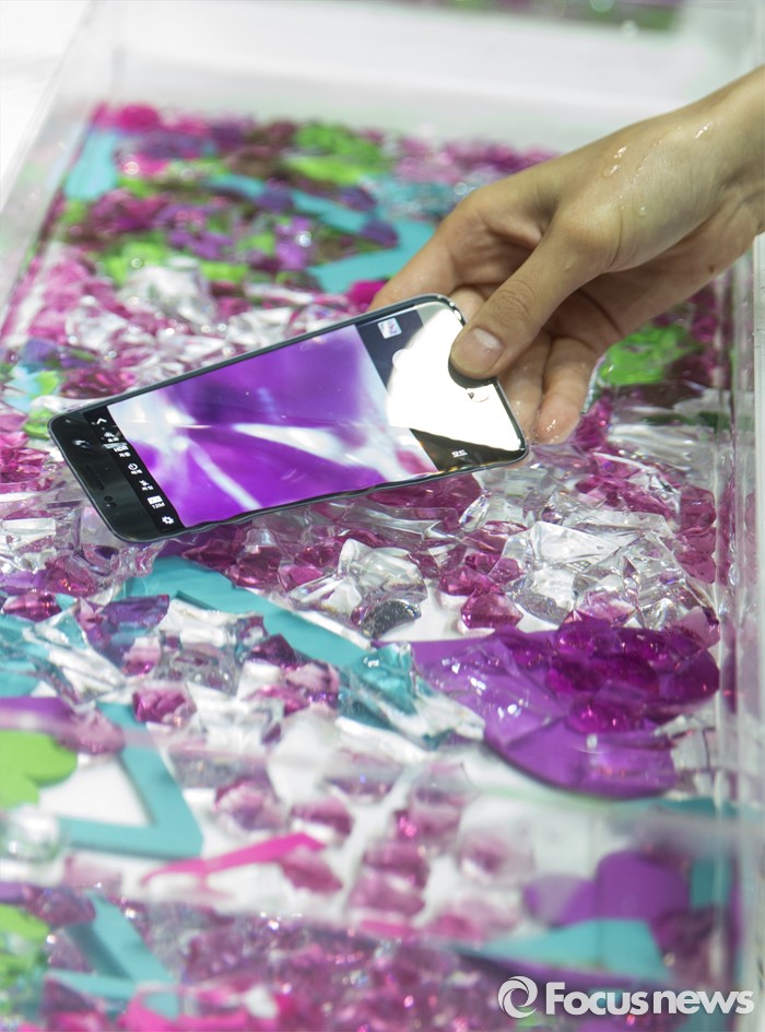 (서울=포커스뉴스) 17일 오전 서울 강남구 코엑스에서 열린 '월드 IT쇼 2016''의 삼성전자 부스를 찾은 한 관람객이 휴대전화를 물에 담그고 있다.