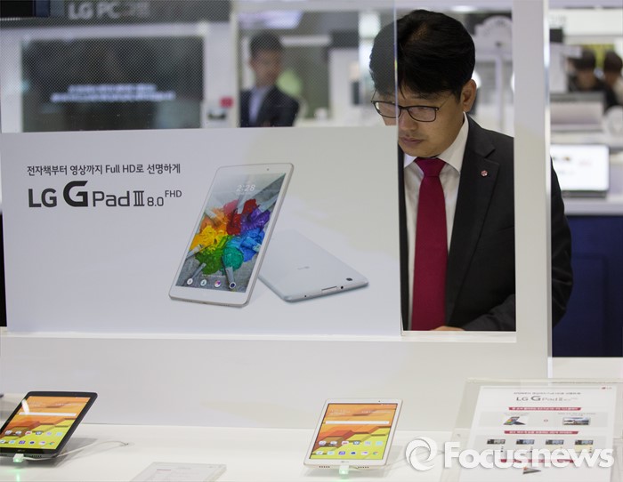 (서울=포커스뉴스) 17일 오전 서울 강남구 코엑스에서 열린 '월드 IT쇼 2016' 에 참여한 한 관람객이 G패드 신형을 바라보고 있다.