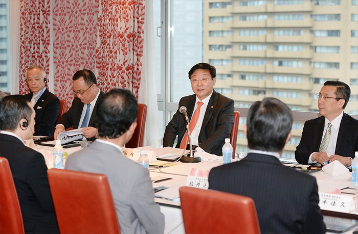 (서울=포커스뉴스) 주형환 산업통상자원부 장관이 17일 일본 동경 오쿠라호텔 메이페어룸에서 도레이BSF, 스미토모화학, 쿠라레, 테이진, 데산트 등 對韓투자 의향 보유기업 16개사 관계자와 김용국 Invest KOREA 대표 등 산업부 담당자가 참석한 가운데 투자 라운드 테이블 행사를 갖고 투자유치 프로젝트 발굴 다각화에 관해 의견을 나누고 있다. <사진제공=산업통상자원부>
