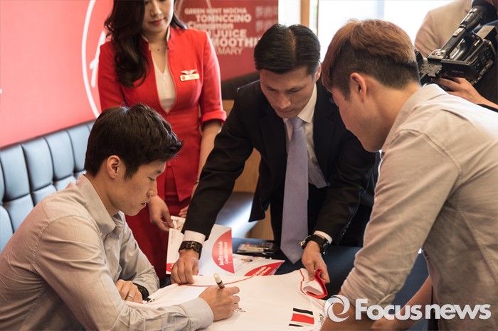 (서울=포커스뉴스) 17일 오후 서울 서대문구 탐앤탐스 신촌로터리점에서 열린 '에어아시아 앰배서더 박지성 사인회'에 참석한 박지성 前 국가대표 축구선수가 한 팬에게 사인을 해주고 있다.